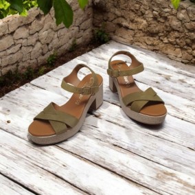 Sandalia tacón ancho sport de mujer y chica de piel de serraje en color Kaki. Sandalia en pala con dos tiras de piel anchas cruzadas en pala. Cierre de trabilla. La plantilla sobre la que te apoyas es acolchada en piel y supercómoda para soportar largas jornadas y condiciones extremas de calor, en las que se hinchan los pies y es necesario un calzado que te garantice bienestar y confort, y su piso es de poliuretano, rugoso aspecto esparto, que te garantiza una gran ligereza y comodidad .Tacón de 8 cm y 3 cm de plataforma.